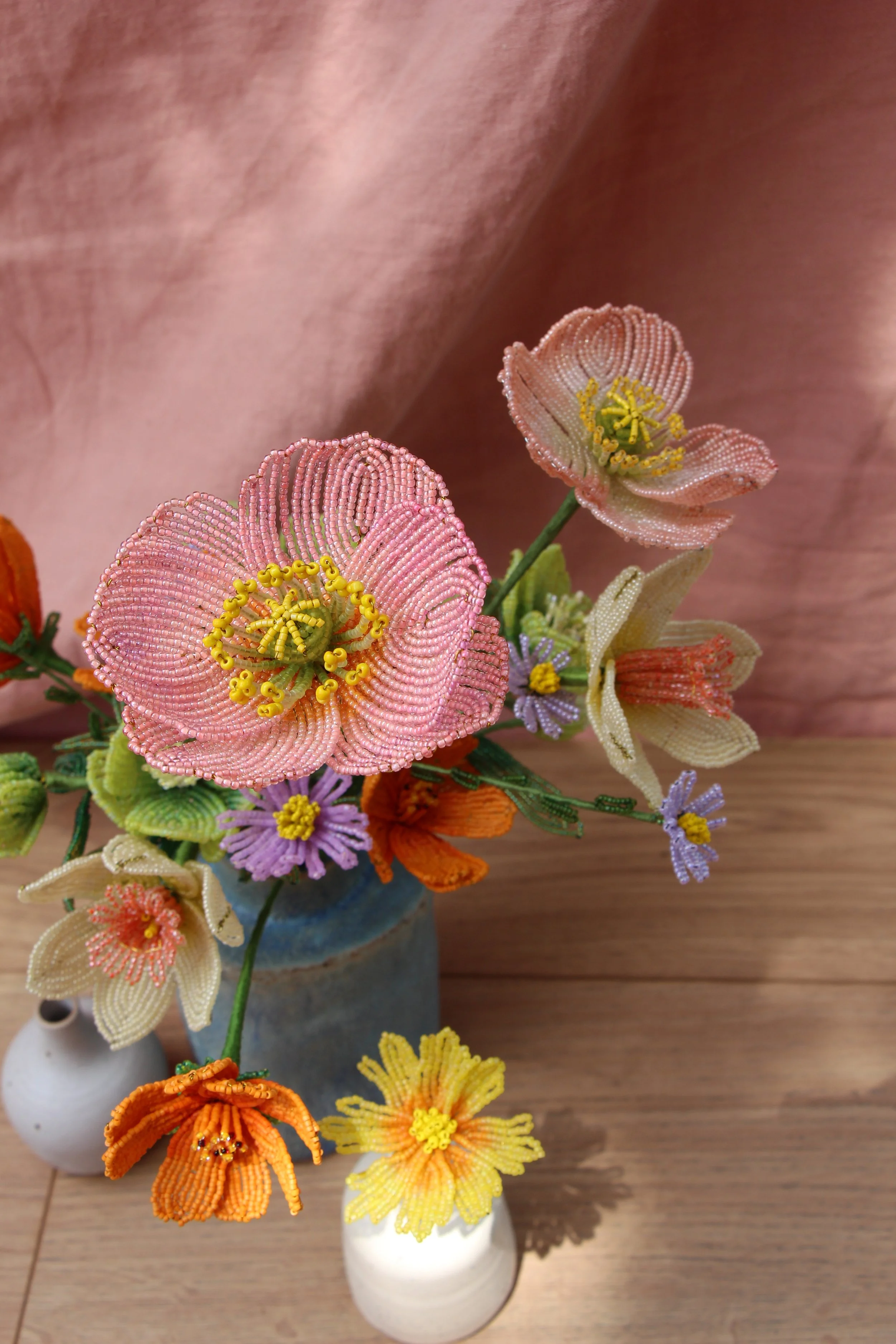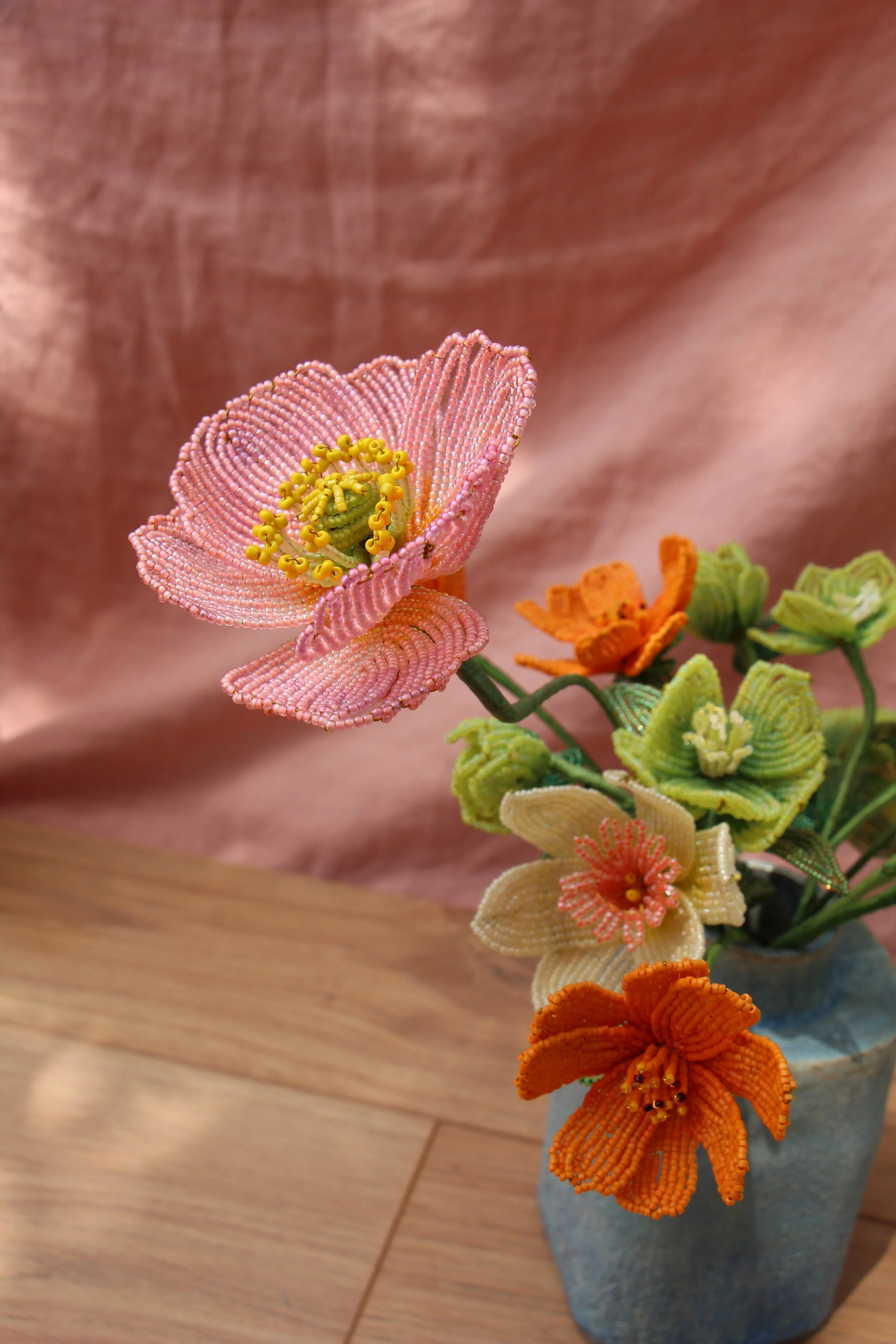 This long poppy is handmade from glass beads, paper, copper wire and cotton thread. Detailed studies of real plants, botanical drawings and photographs helped me to create this piece by hand for you.
