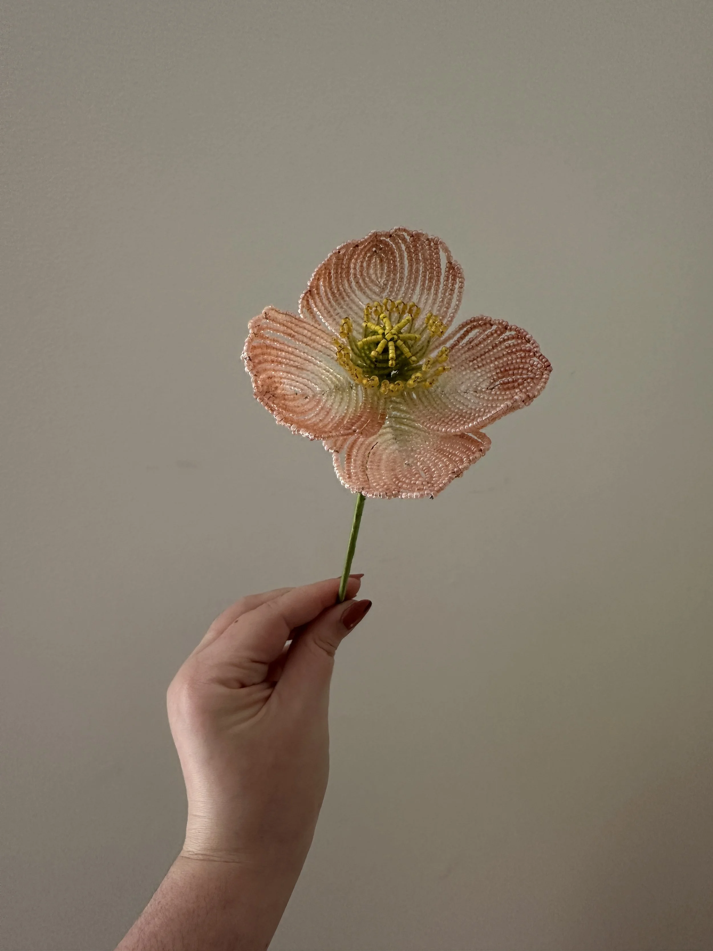 This poppy is handmade from glass beads, paper, copper wire and cotton thread. Detailed studies of real plants, botanical drawings and photographs helped me to create this piece by hand for you.