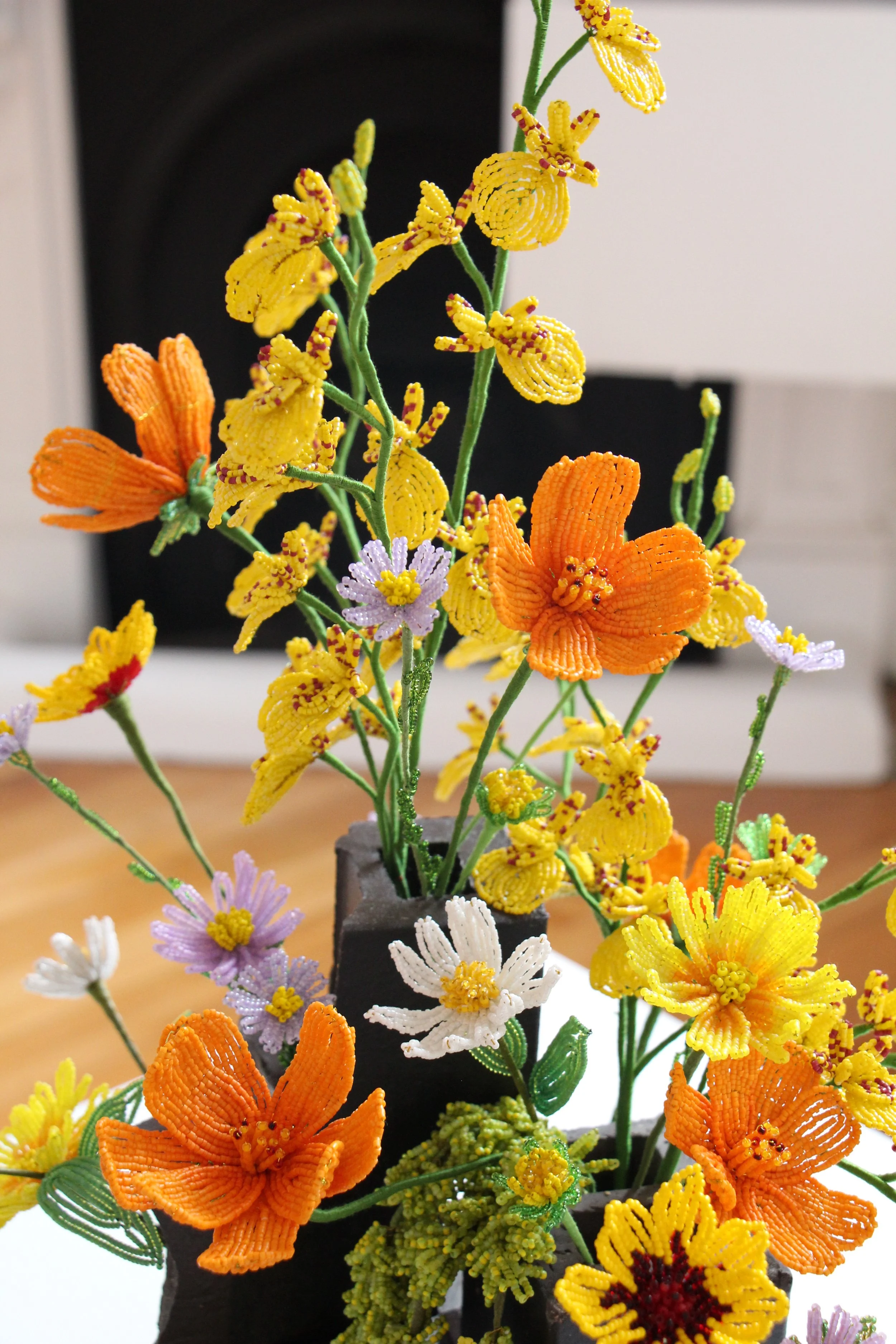 These orchids are handmade from glass beads, paper, copper wire and cotton thread. Detailed studies of real plants, botanical drawings and photographs helped me to create this piece by hand for you.