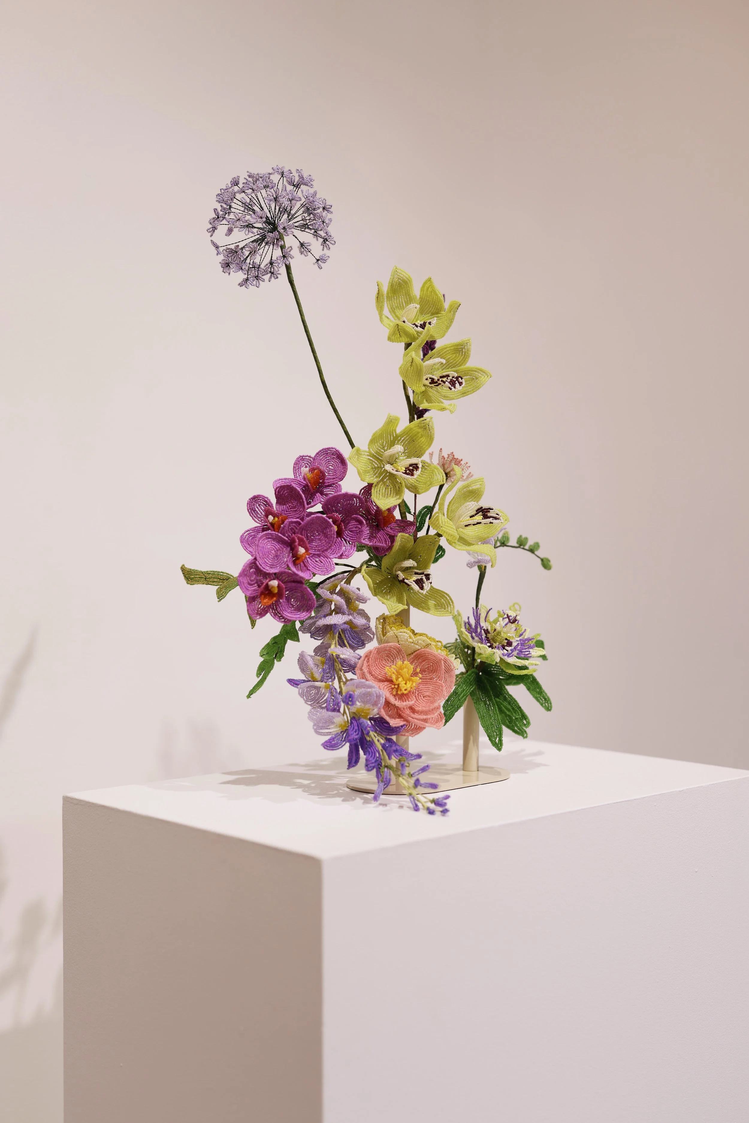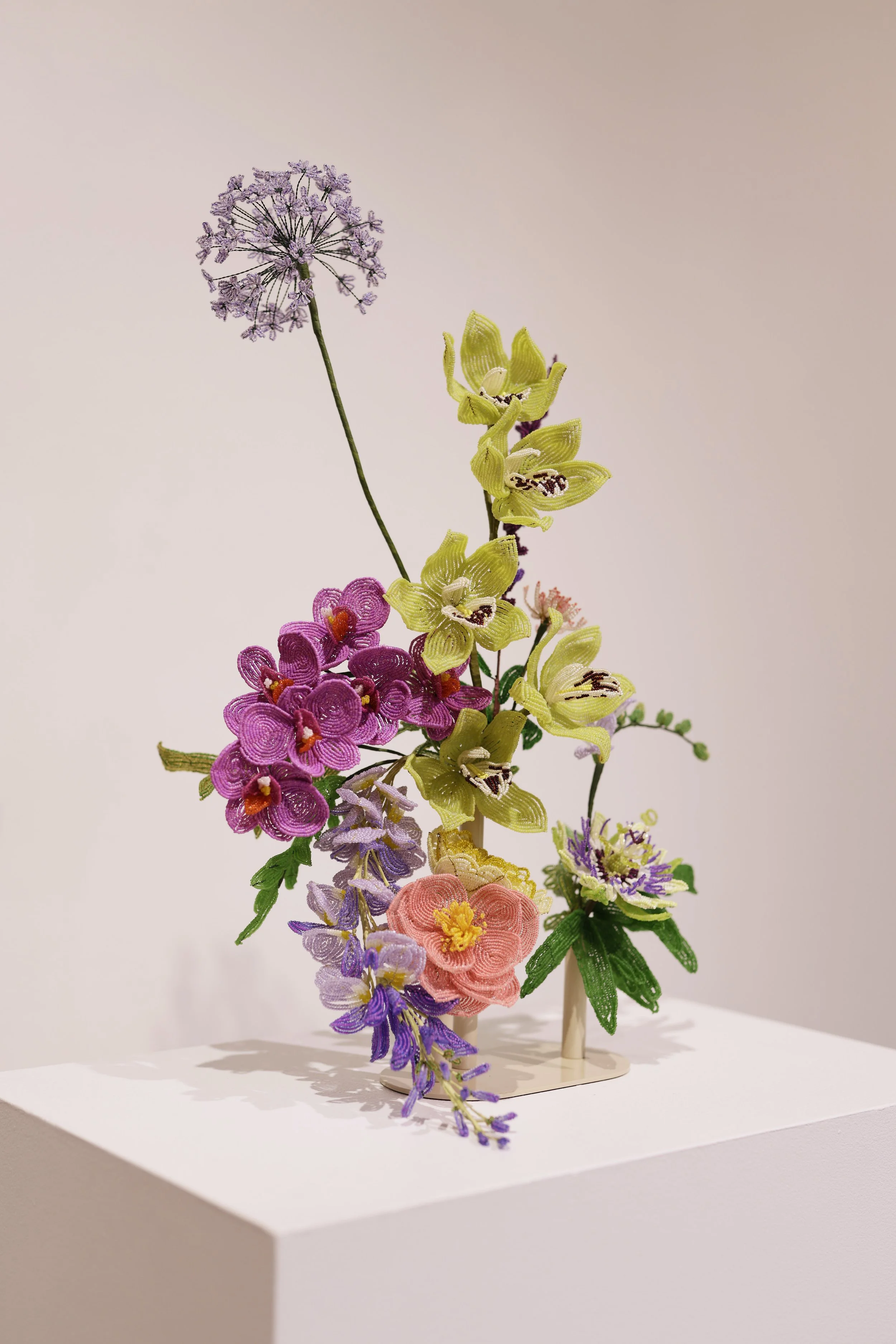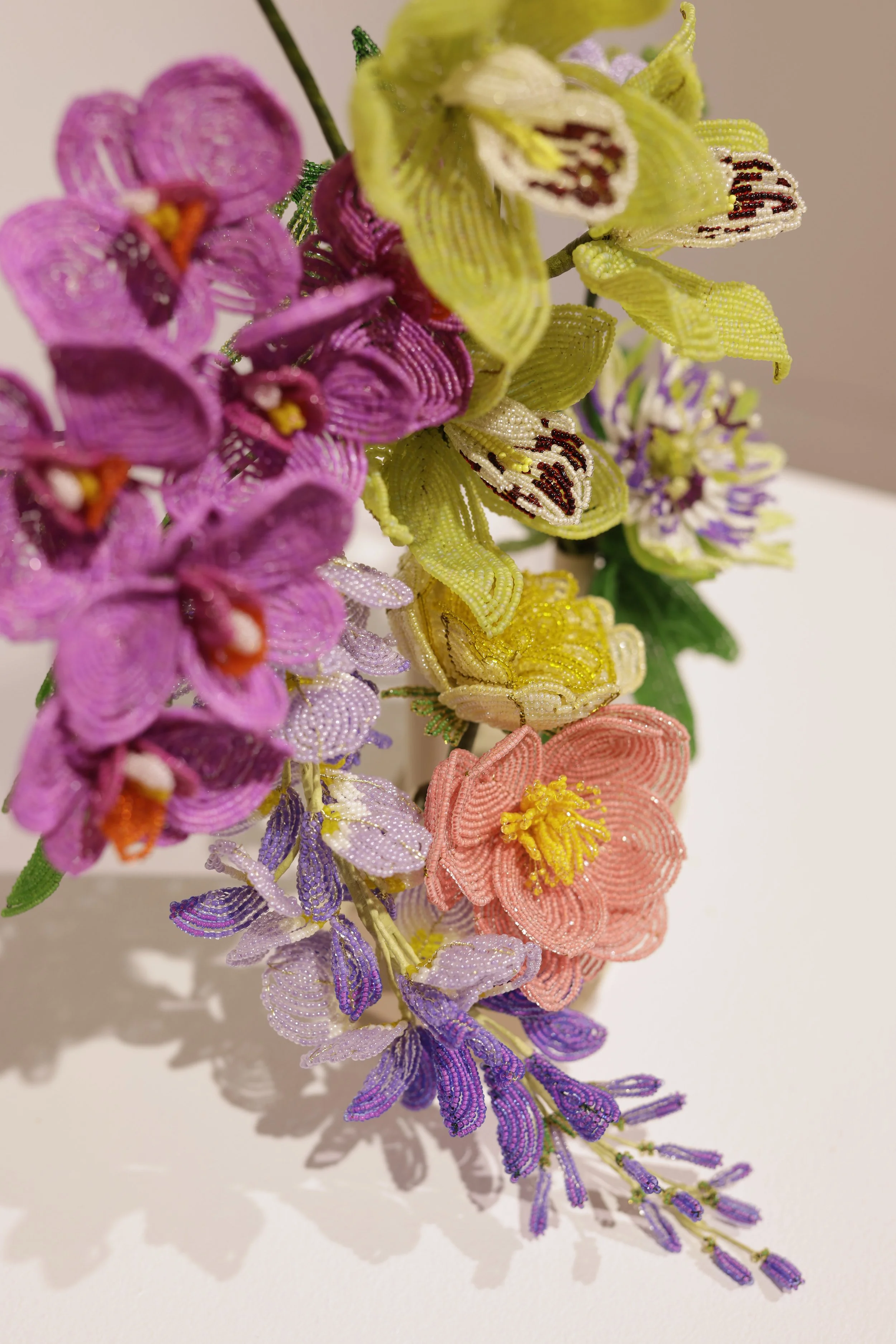 From Emerald Hill, 2022. Glass beads, copper wire, waxed paper, cotton, brass.
